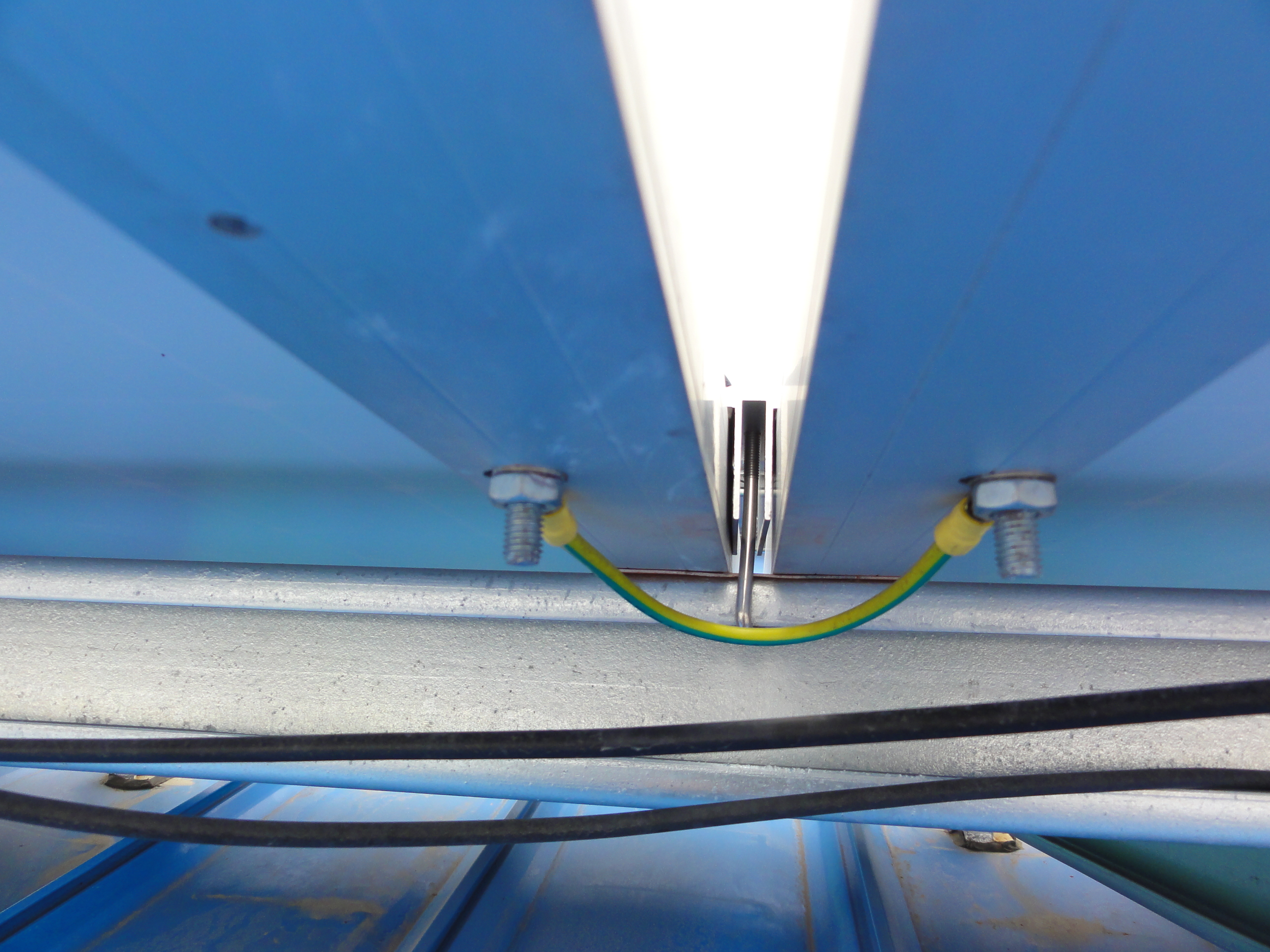 根據(jù)輕鋼結(jié)構(gòu)的建筑物,采用避雷針顯的笨重,與整個(gè)建筑外觀不相協(xié)調(diào),而采用金屬屋面做接閃器,需滿足《建筑物防雷設(shè)計(jì)規(guī)范》(GB50057-2010版)第4.1.4條給出的四個(gè)要求。針對(duì)規(guī)范要求“金屬板下面無易燃物品時(shí),其厚度不應(yīng)小于0.5mm”。廠房圍護(hù)結(jié)構(gòu)(屋面)采用熱浸鍍鋁鋅鋼板,基板厚度為0.53mm(含鍍鋁鋅層),屋面板下加設(shè)玻璃棉墊75mm厚,用鋁箔包裹,用φ1.5不繡鋼絲網(wǎng)層托與檁條上緣部位。用銅導(dǎo)線將電池板與結(jié)構(gòu)鋼連接起來,已達(dá)到屋頂電站的防雷要求,接頭處做好防腐處理。跟鋼結(jié)構(gòu)廠房連接處有些地方可能有油漆會(huì)阻隔導(dǎo)電性能,所以有時(shí)需要把外皮剝掉,做好連接處的節(jié)點(diǎn)后做防腐防銹等處理,否則達(dá)不到防雷的目的。