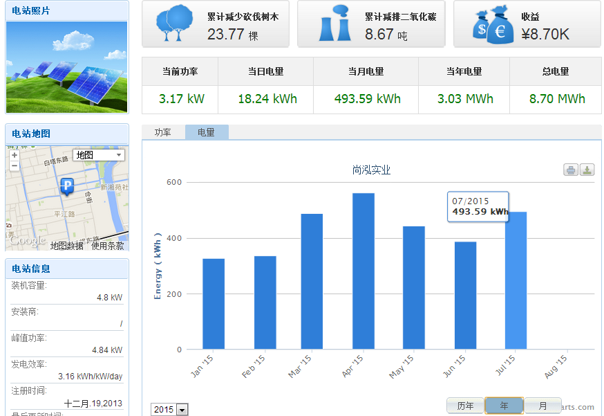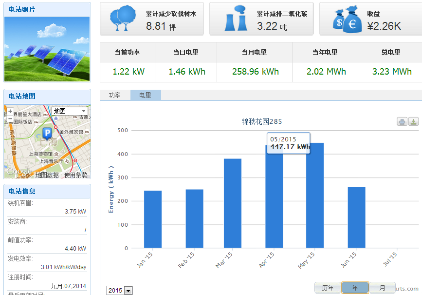 截止到2015年7月31日,系統(tǒng)共工作323天,總發(fā)電量為3660度,平均每天發(fā)電11.33度。理論前7個月份總發(fā)電量232+275+293+376+434=2451度,實際7個月共發(fā)電2440度。此項目實際發(fā)電量和預(yù)計發(fā)電量持平。