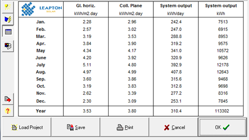 支架25度傾角情況下,裝機容量為97.24KW,用PV-SYST模擬發(fā)電量可知年發(fā)電量約為113301度電。各月發(fā)電情況如下: