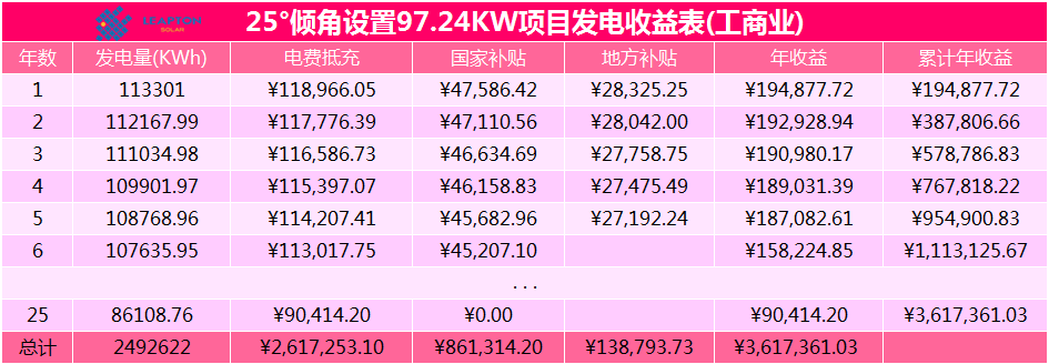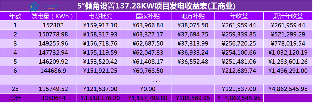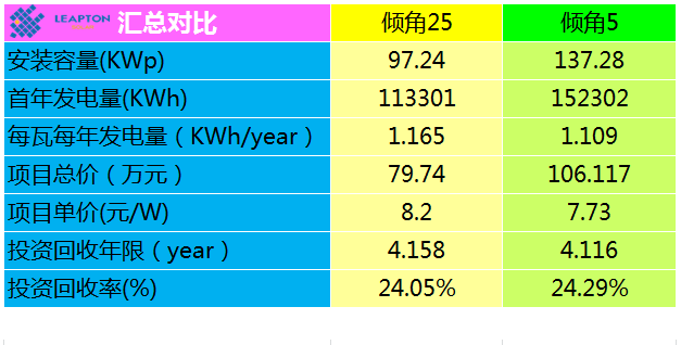 從上面表格可知,25度設置時項目投資回收年限為4.158年,項目年投資回報率為24.05%。5度設置時項目投資回收年限為4.116年。項目年投資回報率為24.29%。