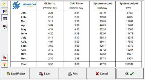 支架5度傾角情況下,裝機容量為137.28KW。用PV-SYST模擬發(fā)電量可知年發(fā)電量約為152302度電。各月發(fā)電情況如下: