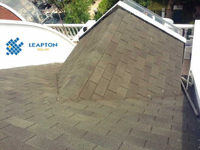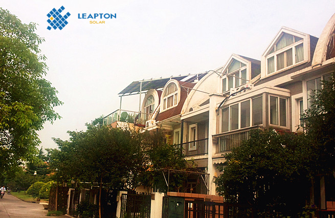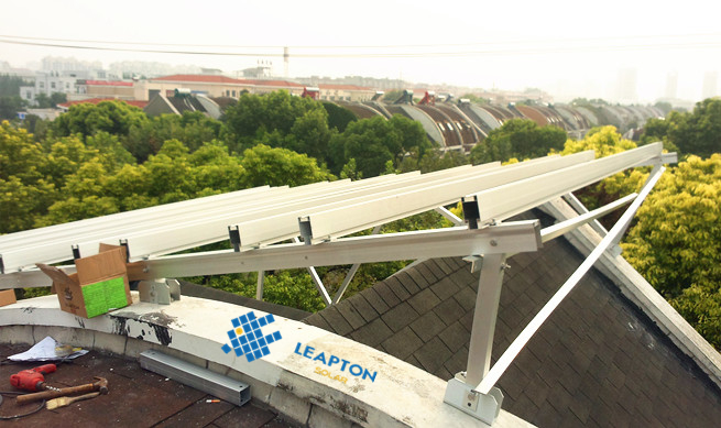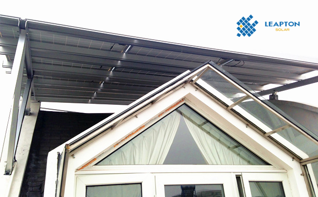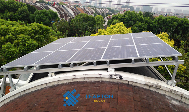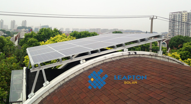 屋頂情況:連棟別墅,混凝土斜屋頂。采用固定式支架,支架通過(guò)膨脹螺栓固定安裝在女兒墻上,支架傾角20度。安裝250W多晶組件15塊, 安裝功率3.75KW。
