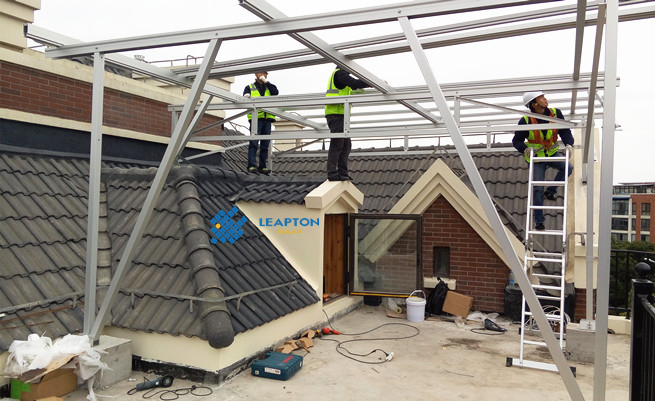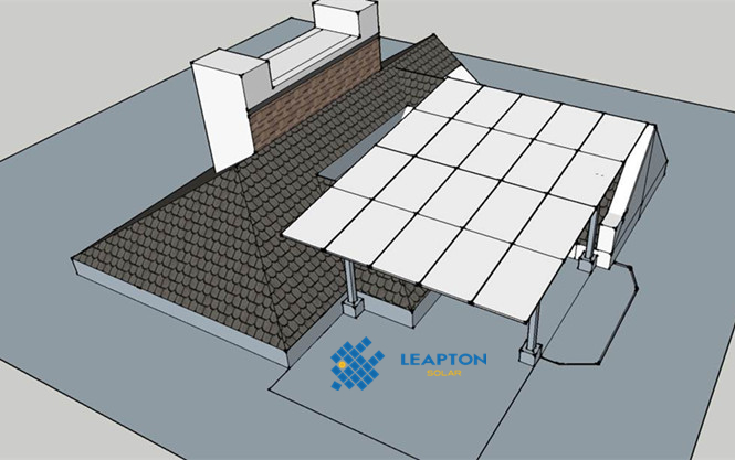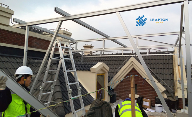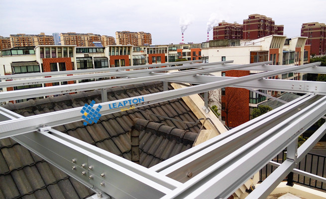 別墅,斜瓦屋頂,屋頂情況較為復(fù)雜,采用起棚式支架,傾角5度,組件安裝在支架上,安裝250W多晶組件20塊,功率5.0KW。