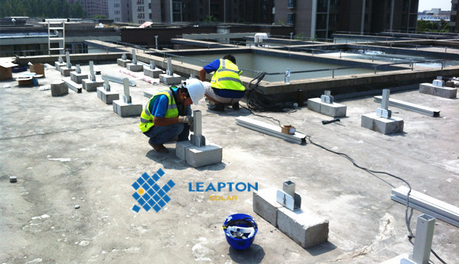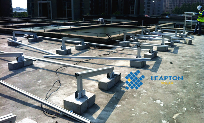 屋頂情況:連棟別墅,混凝土平屋頂。 采用壓載式支架,組件安裝在支架上,避免破壞屋頂防水結(jié)構(gòu),支架傾角15度。經(jīng)建模估算,安裝250W多晶組件20塊, 安裝功率5.0KW。