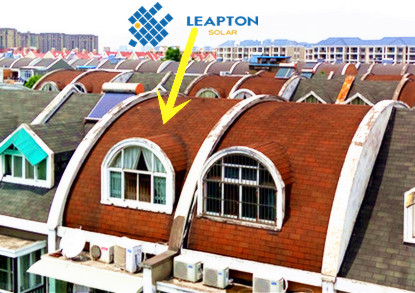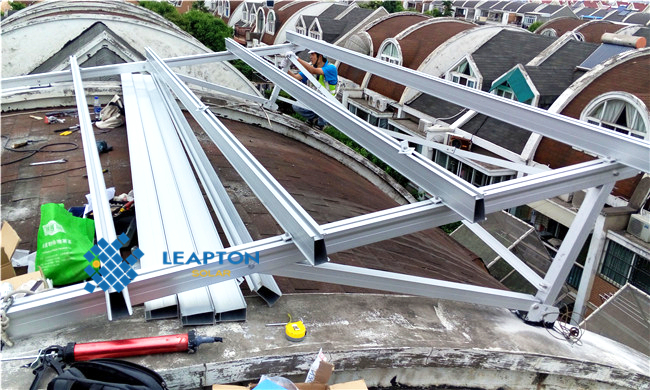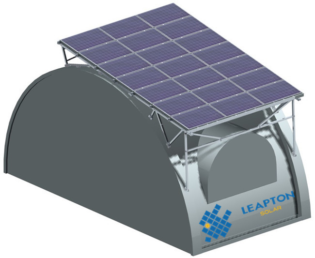 本項目屋頂為混凝土圓弧屋頂,屋面類似半圓,直徑10.6m, 朝向正南。依據(jù)現(xiàn)場情況可采用棚式鋁合金支架。經(jīng)建模預(yù)計安裝250Wp多晶組件21塊,安裝總功率5.25KW。