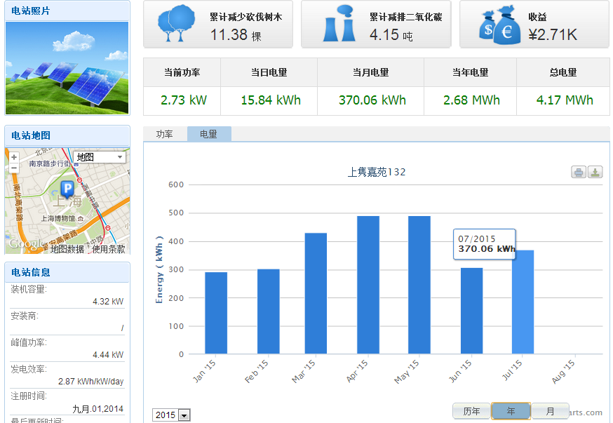 截止到2015年7月31日,系統(tǒng)共工作326天,總發(fā)電量為4170度,平均每天發(fā)電12.79度。