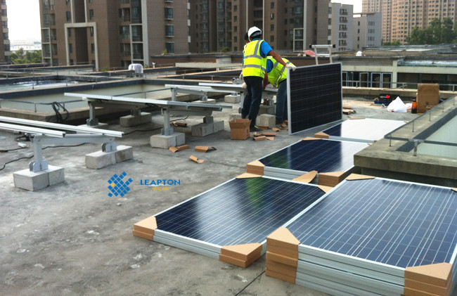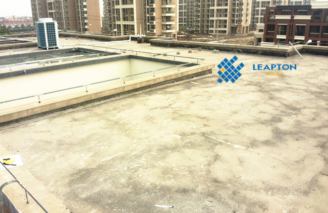 屋頂情況:連棟別墅,混凝土平屋頂。 采用壓載式支架,組件安裝在支架上,避免破壞屋頂防水結(jié)構(gòu),支架傾角15度。經(jīng)建模估算,安裝250W多晶組件20塊, 安裝功率5.0KW。
